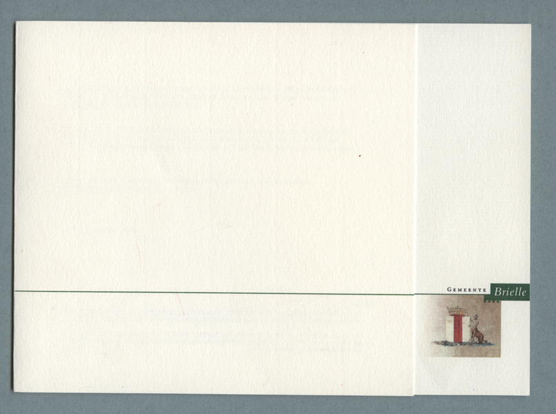 Kaart zijnde een uitnodiging van de installatie van Gregor Rensen als burgemeester van de gemeente Brielle op 28 oktober 2014, gehouden in de Sint Catharijnekerk te Brielle. Uitnodiging namens L.C.M. van Steijn (griffier) en J.C. Wolters (plaatsvervangend voorzitter). Kaart is wit, voorkant kleiner uitgesneden waardoor wapen van Brielle rechtsonder in de binnenkant in gevouwen toestand ...