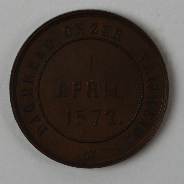 Gedenkpenning, bronskleurig, aan de voorzijde voorzien van de tekst 'DAGERAAD ONZER VRIJHEID, 1 APRIL 1572'. Op de keerzijde de afbeelding van de Hollandse tuin met daarin een sinaasappelboom en de vrijheidshoed op een paal. Daarboven '1572 1872'.