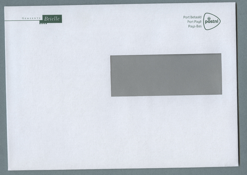 Envelop, zijnde een vensterenvelop van Gemeente Brielle. Linksboven het logo van gemeente Brielle, rechtsboven opschrift: 'Port Betaald'. Op de achterkant het postbus van de gemeente.