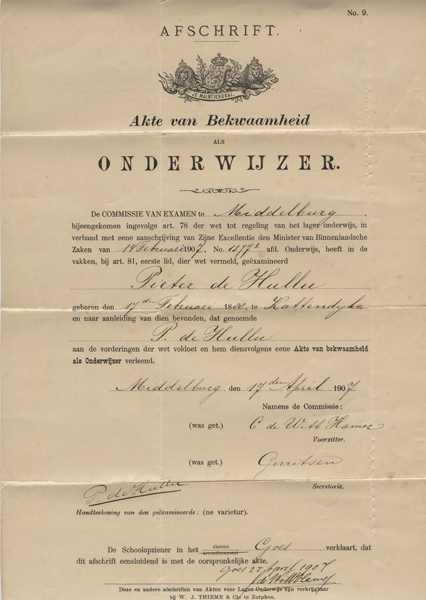 Diploma zijnde Akte van bewkaamheid van Pieter de Hullu (1888-1975) als onderwijzer uitgegeven op 17 april 1907.