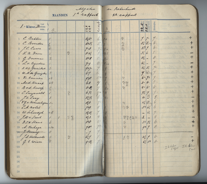 Cijferboekje gebruikt door Pieter de Hullu (1888-1975) als leraar (algebra, rekenkunde, meetkunde, boekhouden) op Rijks HBS te Brielle met daarin de cijfers van zijn leerlingen. Boekje gedateerd 1940-1942. Tussen de bladzijden twee losse notitieblaadjes met opschrift 'Unisys'.
