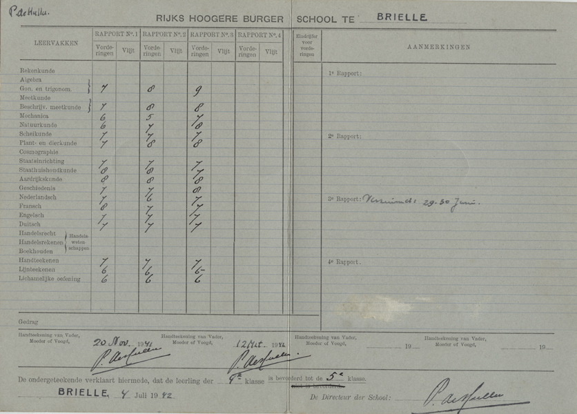 Rapport van Pieter de Hullu (1926-1992) Rijks H.B.S. Brielle klas 4, jaar 1941-1942. Rapport bestaande uit een grijze kaart met in de binnenkant de cijfers van de leervakken.