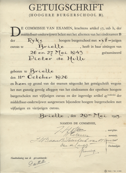 Diploma of getuigschrift van Pieter de Hullu (1926-1992) van de Rijks H.B.S. te Brielle uitgegeven op 29 mei 1943.