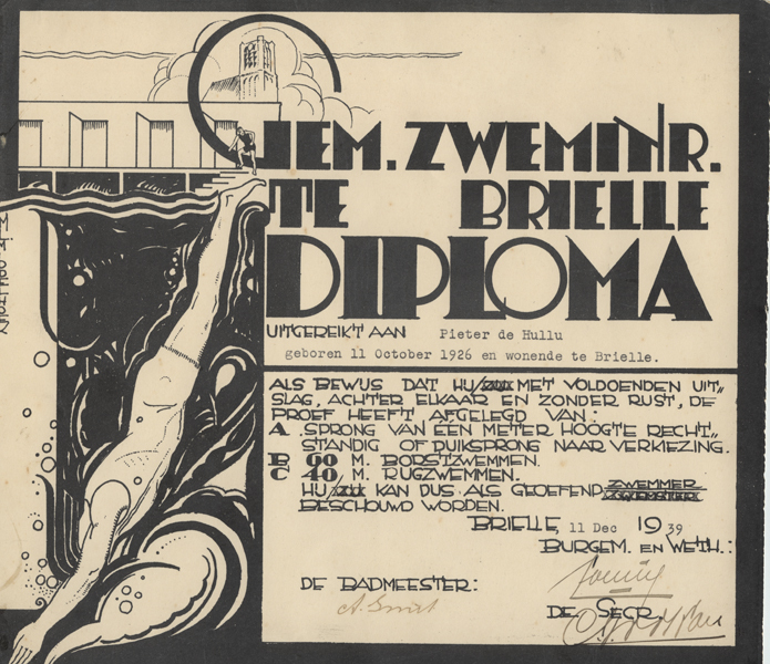 Zwemdiploma van Pieter de Hullu (1926-1992) uitgereikt op 11 december 1939 te Brielle. Links een afbeelding van een duikend persoon, linksboven de Sint Catharijnekerk in medaillon.