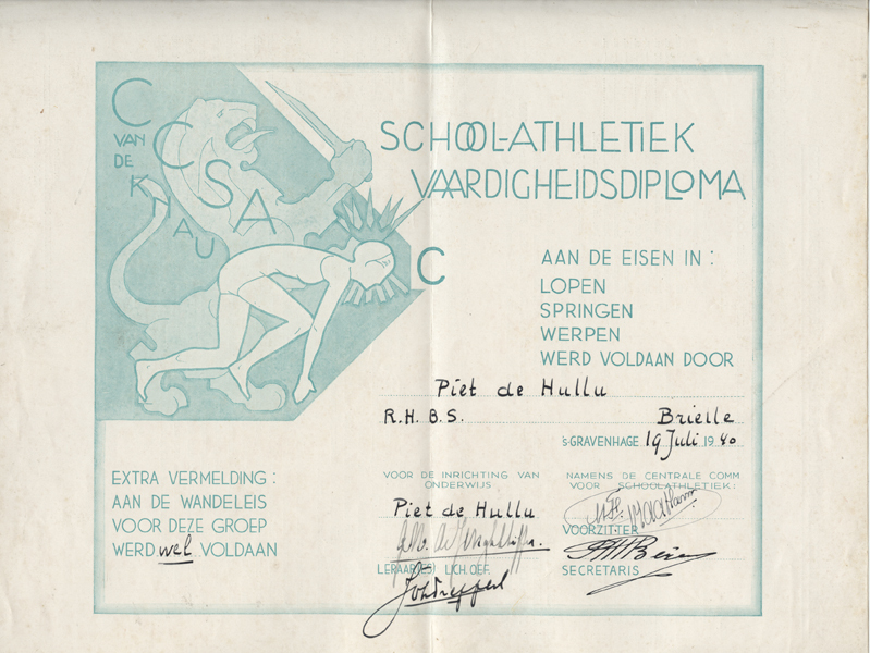 Diploma zijnde een atletiekdiploma van Pieter de Hullu (1926-1992) uitgegeven door Rijks H.B.S. te Brielle op 19 juli 1940. Diploma wit gedrukt met groene inkt. Linksboven een afbeelding van een persoon in starthouding daarachter een leeuw.