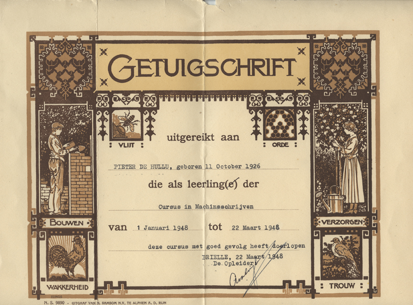 Diploma of getuigschrift voor cursus machineschrijven van Pieter de Hullu (1926-1992) uitgegeven op 22 maart 1948. Getuigschrift in de kleuren bruin en geel. Langs de zijkanten diverse afbeeldingen van o.a. een haan met opschrift 'Wakkerheid', persoon aan het metselen met opschrift 'bouwen', een hart, een bij met opschrift 'vlijt' een geometrisch patroon met opschrift 'orde' ...