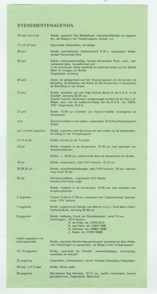 Gids getiteld: Voorlichtingsblad Gemeente Brielle juni 1981 2. Op binnenkaft belangrijke telefoonummers. Inhoud: Een praatje bij een plaatje (Arsenaal), De overeenkomsten, niet de tegenstellingen zoeken', VVV nieuwe stijl voor vreemdelingen en inwoners, Welzijn onder een nieuwe paraplu, Buurtbus wie wil er rijden?, in het Arsenaal stijlvolle kantoren, Met vlag en wimpel, Sportnota te koop, Bibliotheek ...