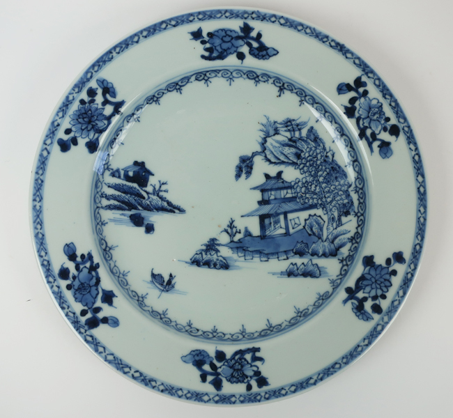 Bord, sierbord met in het midden een visser die met zijn boot aan het varen is in een breed rivierlandschap met een paviljoen van twee verdiepingen naast pijnbomen en rotsen op de nabijgelegen oever. Het geheel roept een Oosters sfeer op. De binnen- en buitenrand zijn voorzien van een bies met daartussen florale motieven. Op ...