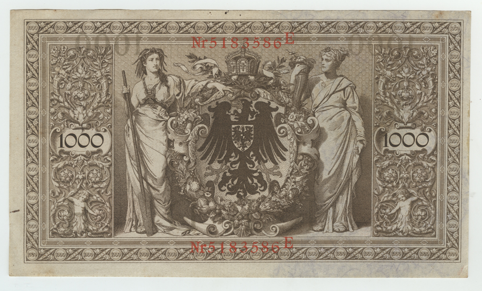 Duits bankbiljet zijnde 1.000 Mark. Bankbiljet in bruin en rood. Op voorkant twee keer in rood embleem met adelaar.