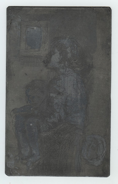 Etsplaat, zink, met portret van een vrouw met kind. Portret vrouw en profile naar links, in haar armen draagt zij een jong kind. Op de achtergrond links een venster of spiegel. Niet gesigneerd.