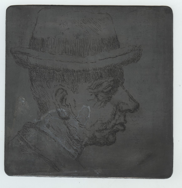 Etsplaat, zink, met portret van man met hoed. Portret en profile naar rechts. Man heeft kort haar. Niet gesigneerd.