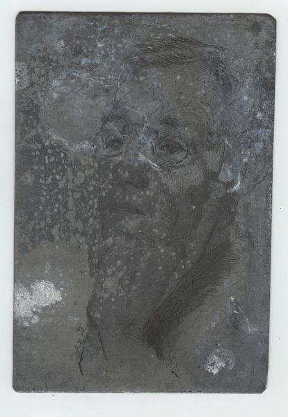 Etsplaat, zink, met portret van een man. Hoofd naar links gedraaid. Man heeft kort haar en draagt een bril. Hij houdt zijn linkerhand onder zijn kin. Niet gesigneerd.