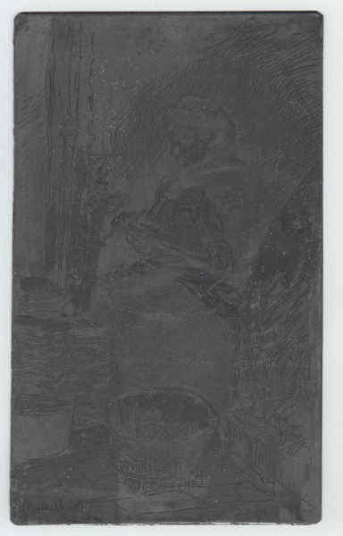 Etsplaat, zink, met van een aardappel schillende vrouw. Op de achtergrond zit een vrouw, en profile naar links. Ze draagt een mutsje en heeft een omslagdoek om haar schouders. Op haar schoot een schaal geschilde aardappels. Mogelijk gesigneerd linksonder.