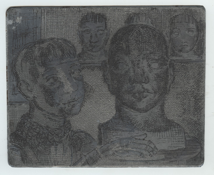 Etsplaat, zink, met portret van een jongen. Links de jongen, rechts van hem vier koppen.