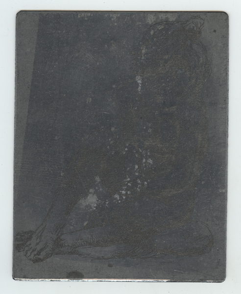 Etsplaat, zink, met portret van naakte vrouw. Ze zit op een kussen, kijkt naar rechts en houdt haar rechterhand over haar linkerpols. Niet gesigneerd.
