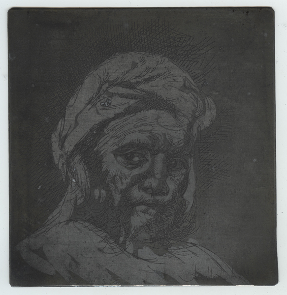 Etsplaat, zink, met portret van vrouw met hoofddoek. Borstbeeld, lichaam naar links gedraaid, hoofd licht naar echts gedraaid. Niet gesigneerd.