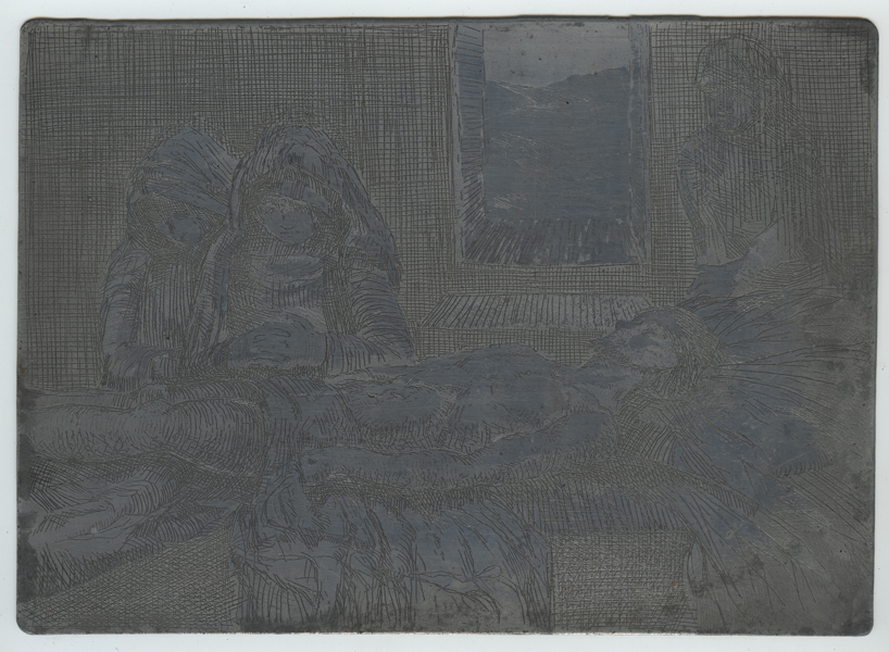 Etsplaat, zink, met bewening van Christus. Links op de achtergrond staat twee vrouwen met de handen in elkaar. Op de voorgrond ligt Christus in een ruimte. Op achtergrond rechts een venster. Niet gesigneerd.