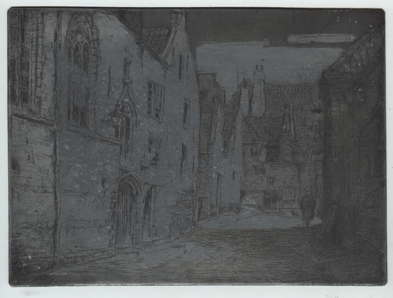 Etsplaat, zink, met stadsgezicht. Links en rechts gevels van huizen. Gevel links heeft twee gotische ramen. Rechts op de achtergrond loopt een persoon over straat. Niet gesigneerd.