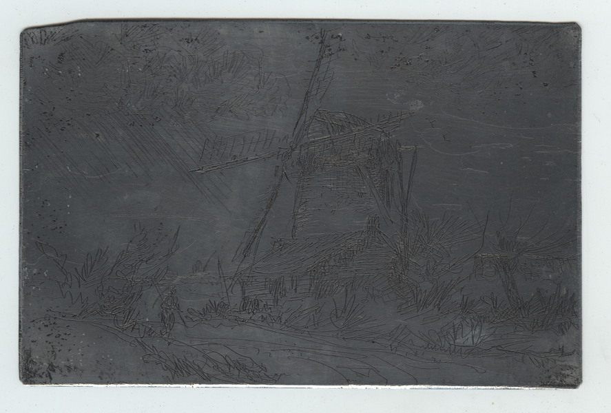 Etsplaat, zink, met zicht op molen in landschap. Niet gesigneerd.