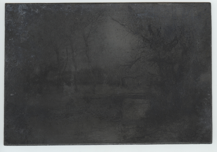 Etsplaat, zink, met landschap van bomen en een brug. Rechts op de voorgrond een grote boom. Links daarvan een brug met daarvoor een persoon in een boot. Links op de achtergrond bomen en enkele gebouwen. Niet gesigneerd.