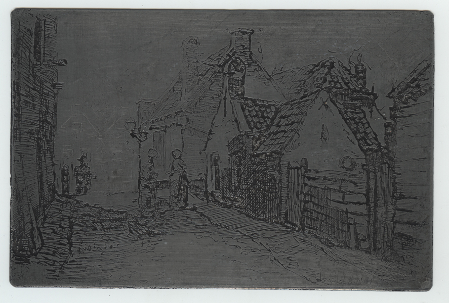 Etsplaat, zink, met gezicht op straatje. Aan rechterkant is een deel van een huis te zien. Aan de linkerkant zijn de huizen beter te zien. Op straat lopen drie personen. Aan de achterkant een vage contour van een persoon. Niet gesigneerd.