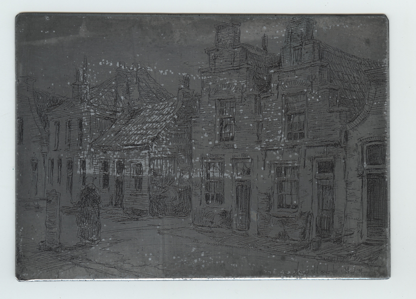 Etsplaat, zink ,met zicht straat te Brielle. Op de voorgrond twee gevels met dezelfde trapgevels. Linksonder loopt een persoon op straat. Gesigneerd rechtsonder.