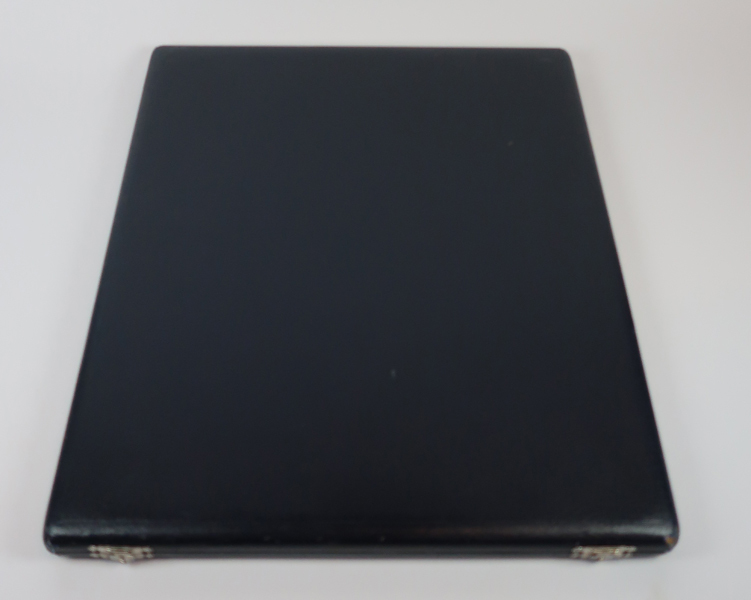 Donkerblauwe cassette voor ambtsketen met scharnierende deksel en slotjes aan de voorzijde. De slotjes zijn bewerkt. De binnenkant bestaat bestaat uit koningsblauw fluweel. De bodem heeft een ingelegde vorm waar de keten in kan liggen.