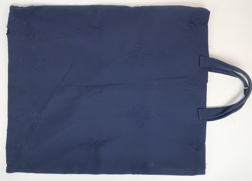 Blauwe tas waarop een aantal Franse lelies zijn geborduurd. De tas is gebruikt om een cassette met daarin de ambtsketen van Brielle te vervoeren.