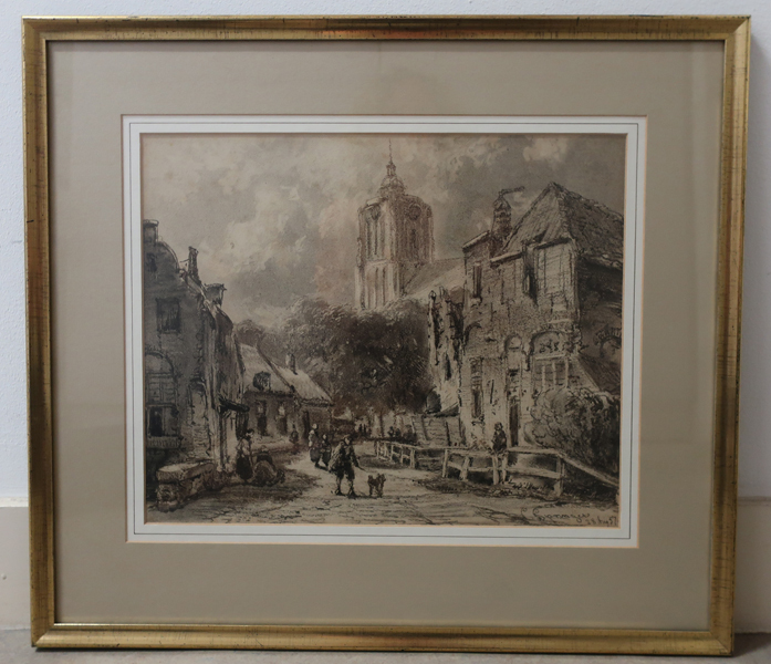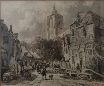 Tekening, houtskool op papier met gezicht op ’t Heultje in Brielle . Op straat lopen verschillende personen. Op de voorgrond een persoon met een hond. Op de achtergrond de Sint Catharijnekerk. Gesigneerd en gedateerd rechtsonder. Tekening zit in een beige passe-partout en smal goudkleurige lijst. Op de achterkant van de lijst een aantal etiketten.