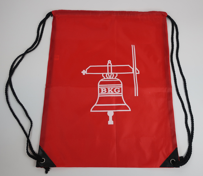 Tas zijnde een rugtas, rood met op de voorkant een wit logo van het Briels Klokkenluiders Gilde. De rugtas is voorzien van zwarte touwtjes die als hengsel gebruikt worden. De rugtas is uitgegeven bij de viering van het 25-jarig bestaan van Briels Klokkenluiders Gilde.