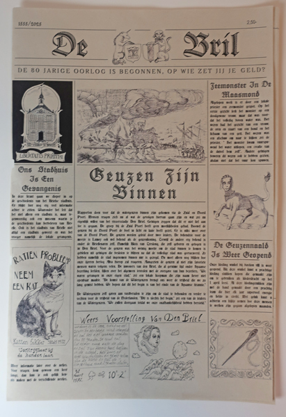 Krant 'De Bril' De 80 jarige oorlog is begonnen, op wie zet jij je geld? Krant, bestaande uit 12 pagina's. Een aantal koppen zijn: 'Ons stadhuis is een gevangenis', 'Geuzen zijn binnen', 'De Geuzennaald is weer geopend', Zeemonster in de Maasmond', Capirussa gespot, 'De bedelaard te water', Los geslagen Lumey, 'In naam van Oranje doe ...