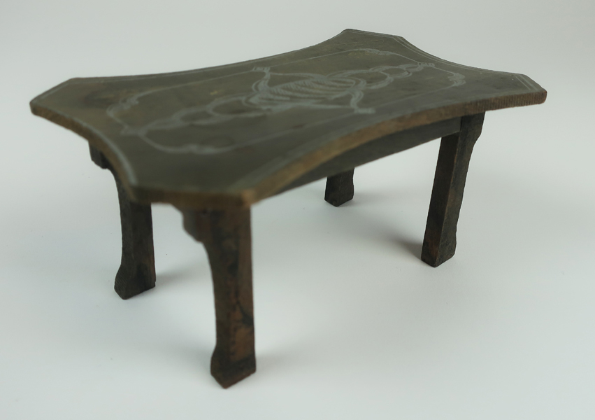 Lange houten tafel uit poppenhuis, groenkleurig, met bewerkte motief op bovenblad.