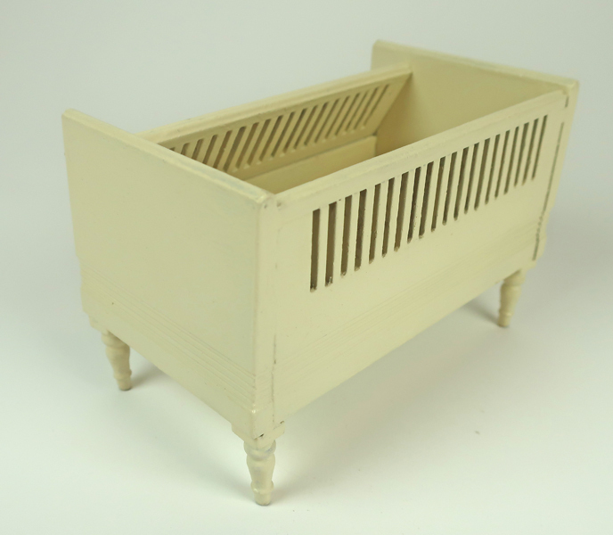 Bed, zijnde wit houten ledikant uit poppenhuis. Eén kant voorzien van scharnierende klep.