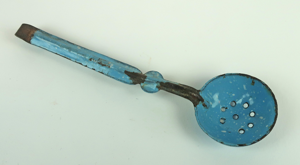 Lepel of schuimspaan, blauw emaille uit poppenhuis