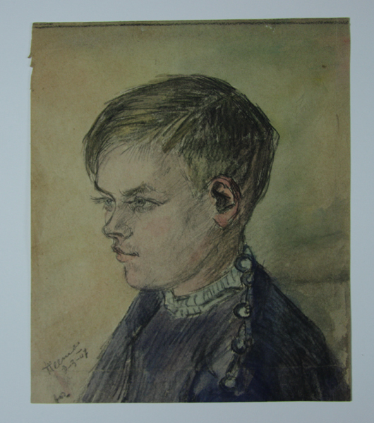Tekening, vermoedelijk pastel, met portret van de nog jonge Cor Lageweg. Borstbeeld, lichaam en hoofd naar rechts gedraaid. Jongen draagt een blauwe jas en blauwe trui met lichte boord. Gesigneerd en gedateerd linksonder.