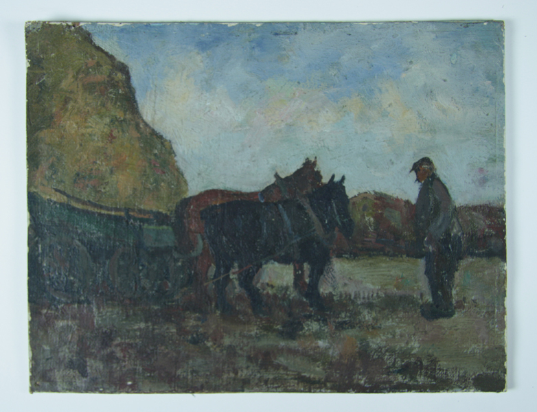 Schilderij, olieverf op linnen geplakt op hardboard met voorstelling van twee paarden met boer op het land. In het midden een zwart met bruin paard die een groene kar trekken. Rechts een boer met pet op zijn hoofd. Links achter de kar met paarden vermoedelijk een hooiberg. Voorstelling tegen een blauwe, licht bewolke lucht. Niet ...