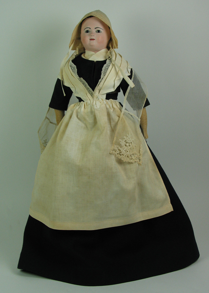 Pop, weesmeisje met klederdracht van het Merula Weeshuis te Brielle. Pop heeft een zwarte jurk aan met crèmekleurige schort en muts. Met bijbehorende standaard.