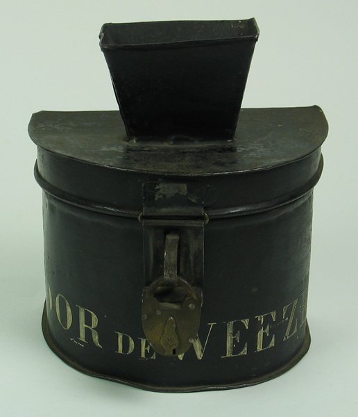 Collectebus, zwart metaal afkomstig van het Merula Weeshuis te Brielle, met trechtervormige geldgleuf. Op de voorkant opschrift: 'VOOR DE WEZEN.' in goud/geelkleurige letters. Collectebus met slot. Sleutel zit mogelijk in de bus zelf.