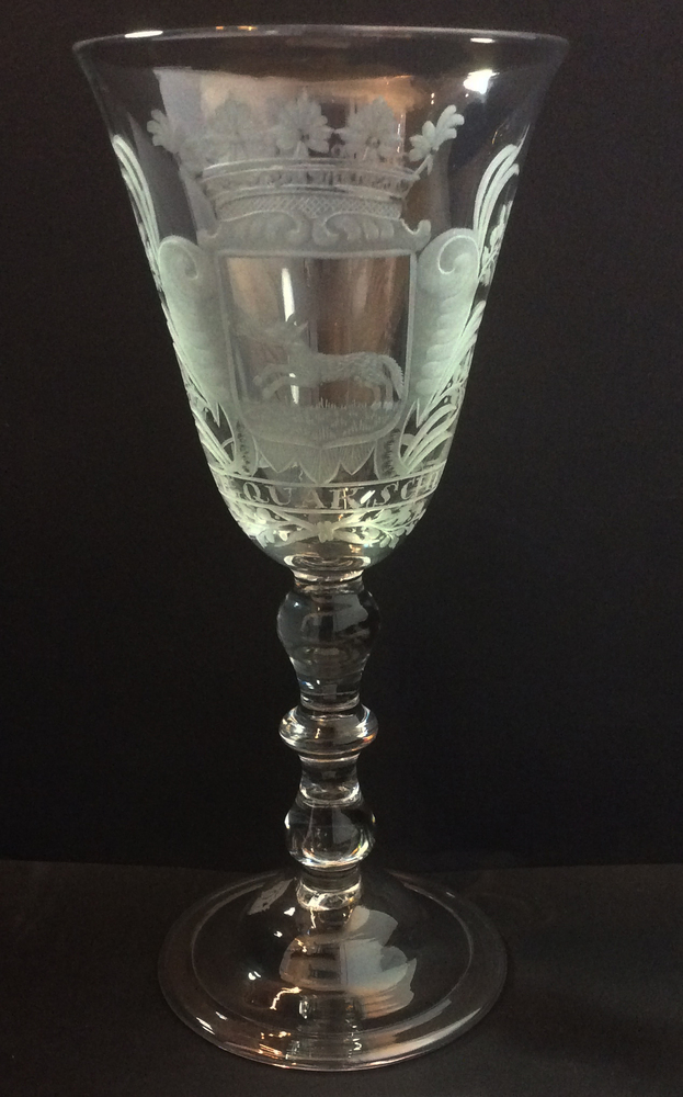 Gelegenheidsglas om een dronk uit te brengen op Jasper Quak. Wijnglas met klokvormige kelk. De stam bestaat uit een centrale afgeplatte knoop met aan weerszijden een gespiegelde balustervorm. Gewelfde voet met omgeslagen rand. Op de kelk een radgravure van een gekroond wapen met aan weerszijden een gespiegelde balustervorm. Gewelfde voet met omgeslagen rand. Wapen met ...