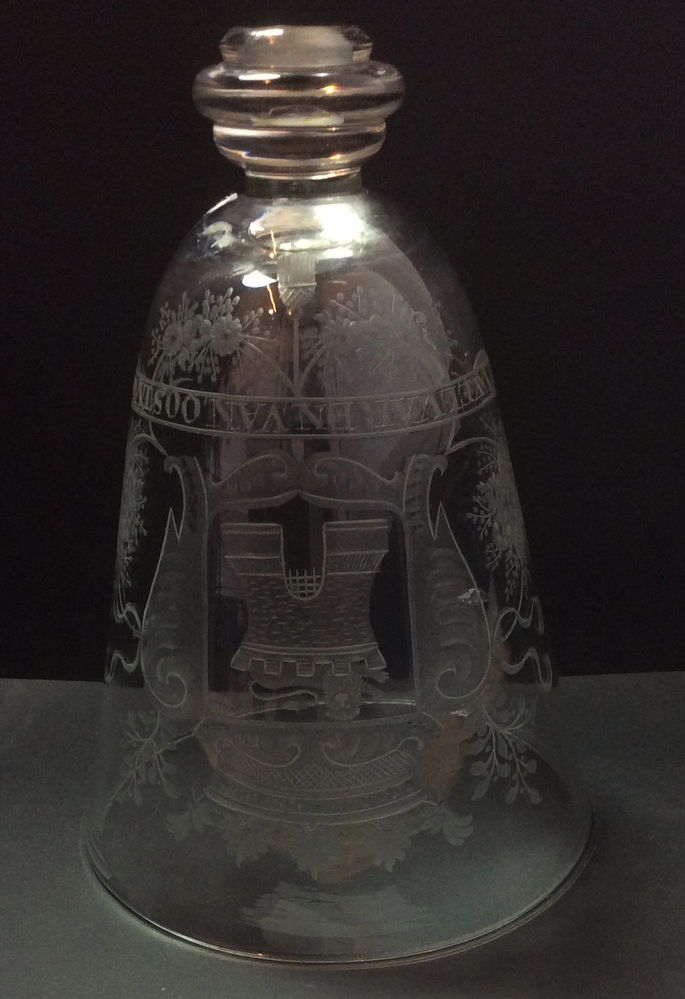 Kelk van de Hensbeker om te drinken op Oostvoorne. Wijnglas met trechtervormige, aan de onderzijde afgeronde kelk op een drievoudig geringde knoop. De rest van het glas ontbreekt. Op de kelk een radgravure van het gekroonde wapen van Oostvoorne, een toren met een leeuw erop met aan weerzijden versieringen. Onder het wapen op een banderol ...