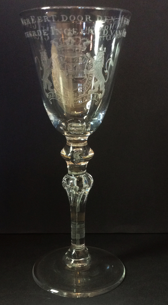 Gelegenheidsglas om te drinken op Willem V. Wijnglas met trechtervormige, aan de onderzijde afgeronde kelk op een hoekige knoop en een omgekeerde baluster met ingestoken luchttranen en basisknoopje. Licht conische voet. Op de kelk een zeer fijne radgravure van het wapen van Willem V (1748-1806) en de inscriptie: 'DIT GLAS IS VEREERT DOOR DEN HEERE ...