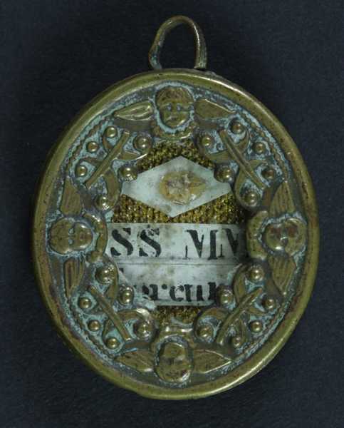 Ovalen reliekhanger met reliek van de Heilige Martaren van Gorcum. De Reliek zit in een verzegelde reliekhouder met onbekend wapen. De voorzijde is versierd met Cherubijnen. Reliek ligt op papier, op textiel met gouddraad. Op de achterzijde een portret van Christus.