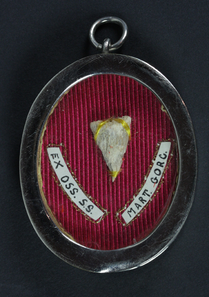Reliek (bot), van van één van de Heilige Martelaren van Gorcum. Reliek zit in een verzegelde reliekhouder met het wapen van pater Theodorus Van Roosmalen, overste van de orde van Redemptoristen (Suriname). Wapen: deus Fortitudo mea, korenhalm. De reliek ligt op rood textiel. Met echtheidsverklaring.