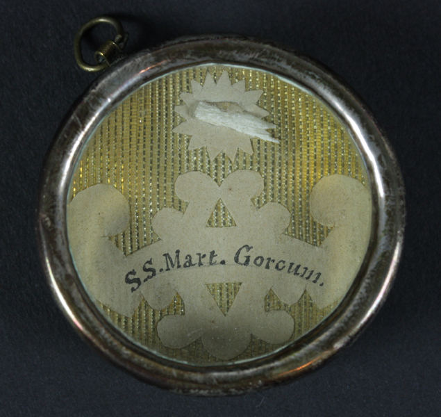 Reliek van van één van de Heilige Martelaren van Gorcum. Reliek zit in een verzegelde reliekhouder met mogelijk het wapen van Joannes van Hooydonk, 1853-1868, bisschop van Breda. Wapen: lam. De reliek ligt op een wit stervormig papier op textiel met gouddraad. Het is een rond reliek met een vaste deksel. Met echtsheidsverklaring.