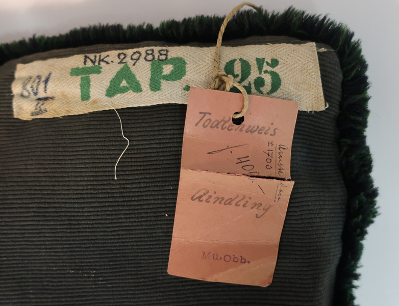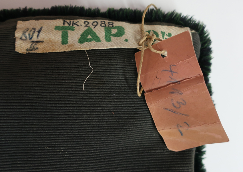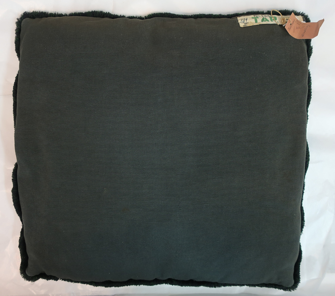 Kussen met polychrome voorstelling van het wapen van Brielle gehouden door een capirussa in medaillon. In medaillon op de achtergrond een rivier met schepen en een toren. Links van het wapen drie mannen rond en in een kale boom. De mannen houden een hoorn (?) vast. Rondom het medaillon een krans van bladeren en vruchten. ...
