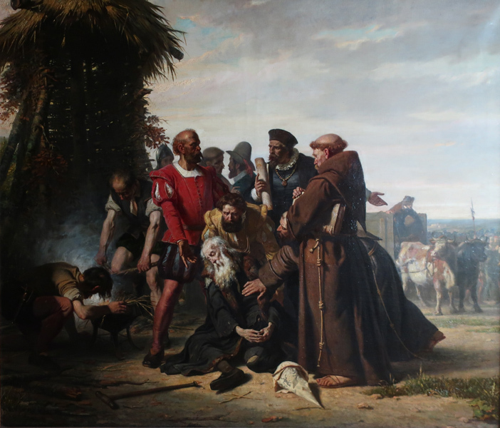 Schilderij, olieverf op doek, getiteld: De dood van Angelus Merula. Schilderij in brede houten lijst.