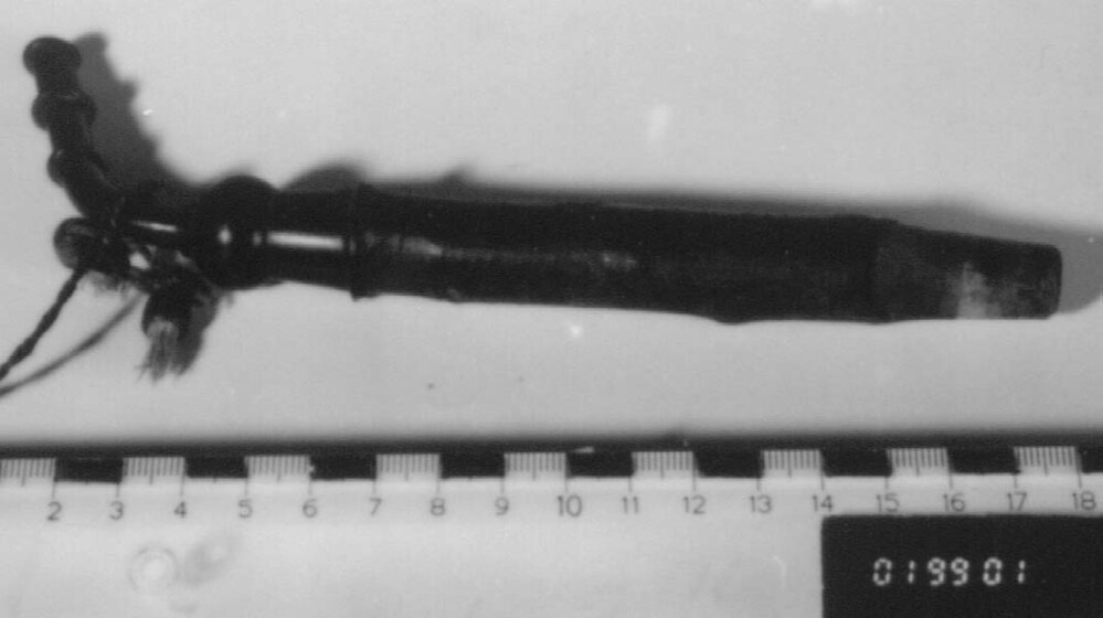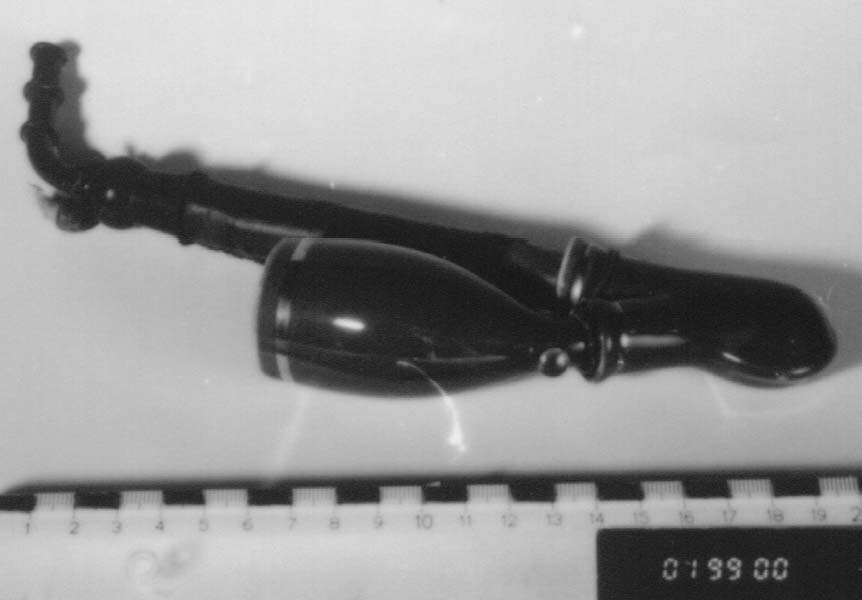 Pijpesteel, met gebogen mondstuk, met een koord verbonden met de pijp.