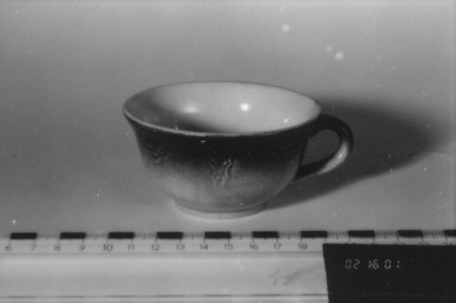 Kop, blauw, voorzien van decoratie in reliëf.