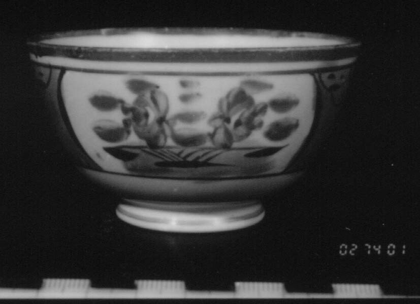 Theekom, oudroze en groen beschilderd, met voorstelling van bloemen in uitsparing in oudroze glazuur.