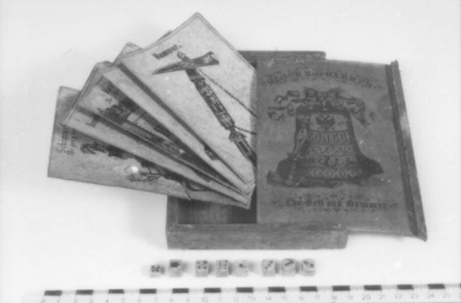 Set dobbelstenen van klok- en hamerspel. Dobbelstenen met aan één zijde zwarte ogen (één t/m vijf). Eén dobbelsteen met voorstelling van hamer en één dobbelsteen met voorstelling van klok.
